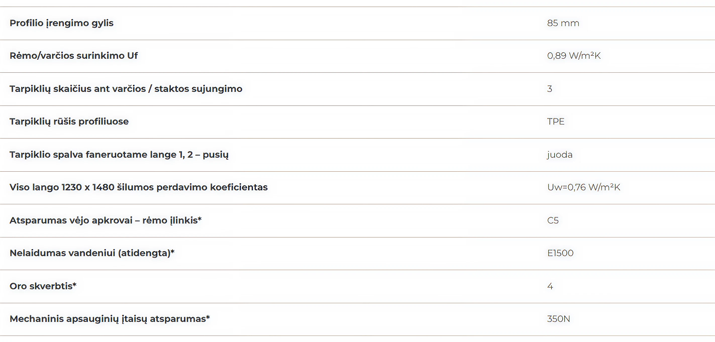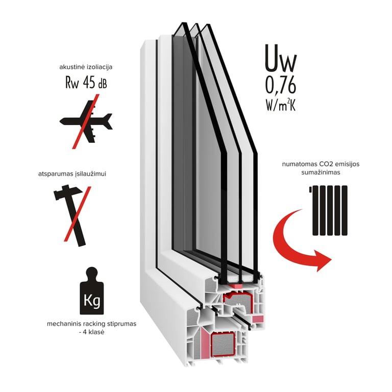 Geresnė akustinė izoliacija dėl įklijuoto stiklo ir įvairios specialaus stiklo paketo konstrukcijos bei trigubo tarpiklių komplekto; energijos vartojimo efektyvumas – energetiškai modifikuoti langų profiliai – reikšmingas šildymo sąnaudų sumažėjimas;