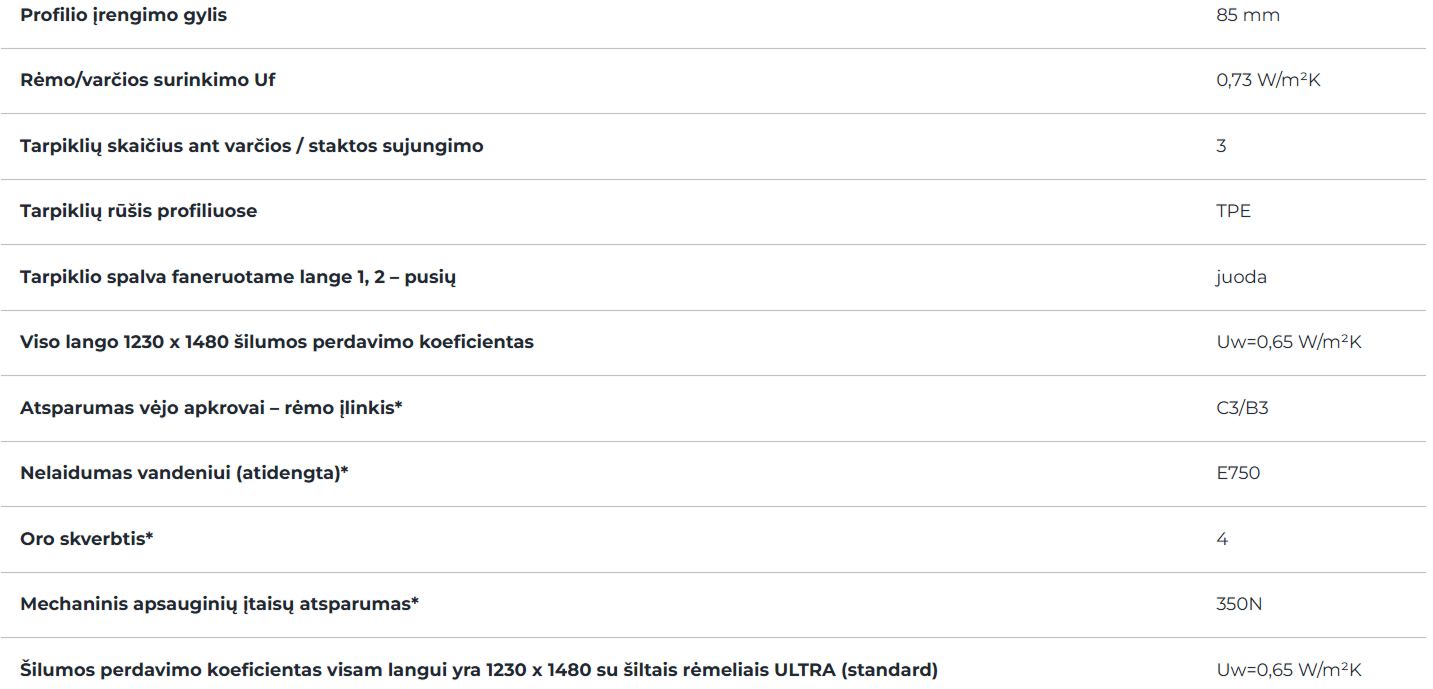 Vietoje tradicinių sutvirtinimų profiliuose naudojami stiklo pluoštu sustiprinti termoplastiniai įdėklai iš BASF medžiagos „Ultradur High Speed“, o kamerų užpildymui naudojamos poliuretano putos. Dėl šių sprendimų užtikrinami ne tik vieni geriausių rinkoje stiklo paketų parametrai, bet ir optimaliai sukonstruoti lango rėmai bei varčios.
